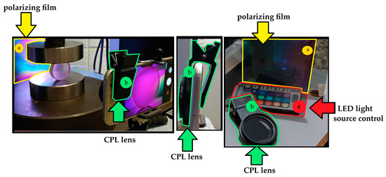 - Kim, S.; Nam, B.-H.; Jung, Y.-H. Evaluating Variability in Reflective Photoelasticity: Focus on Adhesives, Light Sources, and Camera Setup. Appl. Sci. 2023, 13, 10628. [Google Scholar] [CrossRef]