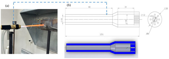 Internal diagram of the HVOF gas–thermal torch of the SX3000 system (a) and its three-dimensional representation (b).