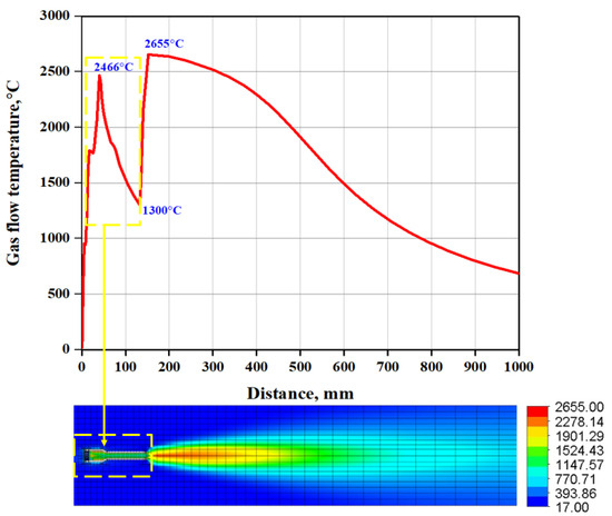 Gas flow characteristics during spraying were modeled, including parameters such as temperature, velocity and gas flow pressure as a function of distance from the nozzle. Figure 4 shows a plot of gas flow temperature versus distance from the nozzle. As can be seen in the graph, the temperature increases sharply, reaching a first peak point of about 2466 °C at a distance of 50 mm. This indicates a significant heat generation in the combustion chamber, as there is a zone near the nozzle where the combustion products (combustible gas and oxidizer) actively interact, creating a strong heat flux. In this area, intense combustion of the propane–oxygen mixture occurs. After the first peak, there is a sharp drop in temperature to 1300 °C. This may be due to turbulent processes caused by the mixing of hot gases and cooling elements such as nitrogen or compressed air.
