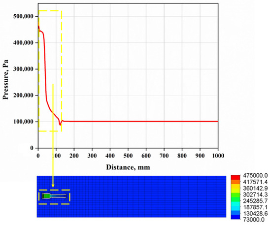 Figure 5 shows the distribution of gas flow pressure at HVOF spraying as a function of distance from the nozzle. The pressure is maximum in the area near the nozzle, and then it decreases sharply in the first 100 mm and stabilizes at around 100,000 Pa. The graph shows that in the combustion chamber (before the gases exit through the nozzle) the pressure reaches maximum values, exceeding 400,000 Pa (400 kPa). Then, as the gases exit the nozzle and further expand, the pressure gradually decreases. At a distance of about 100 mm from the nozzle, the pressure stabilizes at about 100,000 Pa, which corresponds to standard atmospheric pressure and is maintained for the remainder of the chamber length.