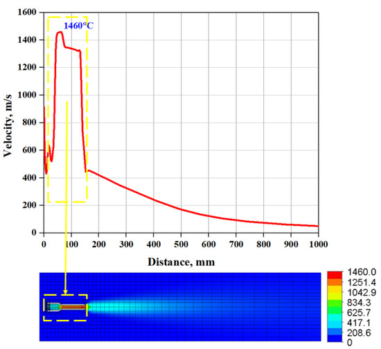 Figure 6 shows the distribution of gas velocity during the HVOF spraying process. The graph shows that the gas velocity in the combustion chamber first increases sharply, reaching maximum values of the order of 1400–1500 m/s at a distance of less than 100 mm. This indicates the active expansion and acceleration of gases as they leave the combustion zone. After passing through the combustion chamber, the velocity stabilizes for a short section and then gradually decreases as the gas leaves the torch. As the distance from the combustion chamber increases, the gas velocity gradually decreases, indicating energy loss and a decrease in the kinetic energy of the flow as it passes through the nozzle and during the spraying process. The heat map at the bottom of the graph shows the distribution of velocity as a function of distance. A color scale ranging from red (maximum velocities) to blue (minimum velocities) demonstrates the velocity distribution in space. The green and yellow (red) areas indicate areas of high velocity, reaching a maximum near the combustion chamber, while the blue areas show areas of zero velocity, indicating that the gas has little or no movement at these locations.