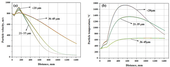 Predicted particle characteristics in the gas stream as a function of distance: (a) particle velocity of <20 µm, 21–35 µm and 36–45 µm fractions (m/s); (b) particle temperature of <20 µm, 21–35 µm and 36–45 µm fractions (°C).
