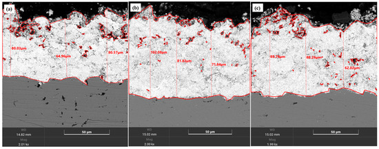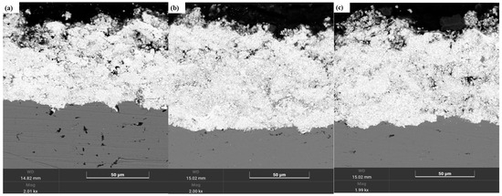 SEM images of the cross-sectional morphology of 86WC-10Co-4Cr metal–ceramic coatings obtained with varying powder fractions. (a) up to 20 μm (sample 1); (b) 21–35 μm (sample 2); and (c) 36–45 μm (sample 3).