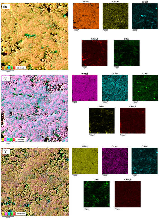 Based on the presented images, it can be concluded that the coatings made using powders of fractions 21–35 μm (sample (b)) and 36–45 μm (sample (c)) show a more uniform distribution of key elements compared to the fraction up to 20 μm (sample (a)). The most homogeneous distribution is observed in sample 2 (Figure 10b), indicating a high coating quality and material density. Elemental mapping indicates that tungsten carbide (WC) particles are uniformly distributed in the CoCr matrix phase. It is possible that the lower tungsten carbide, W2C, may also be dispersed in the cobalt binder, which is consistent with the literature data, where the formation of W2C around WC is attributed to the decarburization of WC in the HVOF process [25,26].