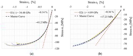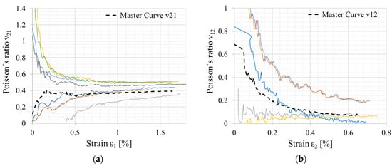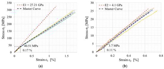 The characterization of the tensile properties is conducted according to DIN EN ISO 527-5 using type A specimens. To assess the strain state and calculate the Poisson’s ratios and , an optical measurement system GOM was used. Figure 1 illustrates the longitudinal (a) and transversal (b) stress–strain behavior of UD specimens (at least 5 samples, shown with different colors). The master curves, additionally included in the diagrams, represent the average curves of all tested samples and serve as a basis for discussion and material modeling.