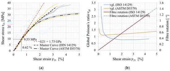 Results of the shear tests according to DIN EN ISO 14129 and ASTM D5379 (a, at least 5 samples per test type, shown with different colors) and calculated global Poisson’s ratios and fiber rotations (b).