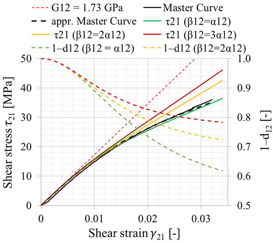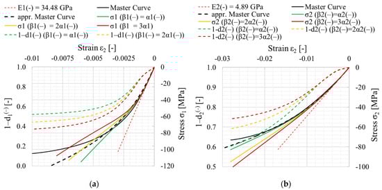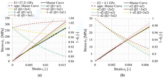 Figure 5, Figure 6 and Figure 7 illustrate the influence of the correction factors on the damage variables and the resulting approximated stress–strain curves. The experimental determinated stress–strain relationships are described using master curves. The approximation functions and the corresponding parameters and are computed using a Python script. To better illustrate the influence of the correction factor , values of are used as multiples of the values.