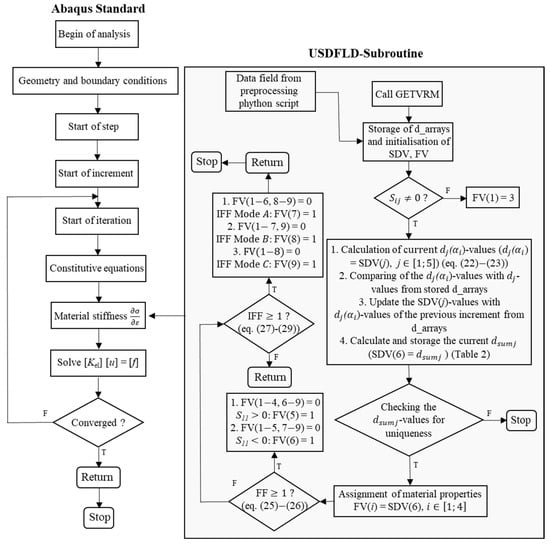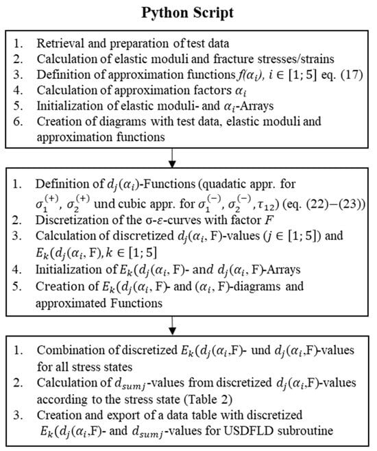 The developed computational process consists of two consecutive computational steps: a pre-processing Python script for calculating the material data field and characteristic values (Figure 8) and a USDFLD subroutine (Figure 9). In addition to the computational algorithm, the USDFLD includes a failure criterion according to PUCK [53] for the plane stress state, with a subsequent failure-mode-dependent material degradation formulation leading to element deletion.