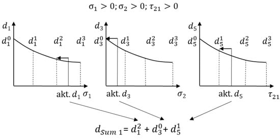 To realize the coupling of normal and shear stresses, the values are combined in such a way that all four potential stress combinations are considered. To uniquely identify the material stiffnesses resulting from the superimposed mechanical loads, a sum of the damage variables associated with the stress state, (with ) is formed. Figure 10 and Table 2 illustrate an example calculation of . Depending on the present strain and stress state, individual values are calculated at each increment, and is formed from the previous values of the discretized ()-curves.