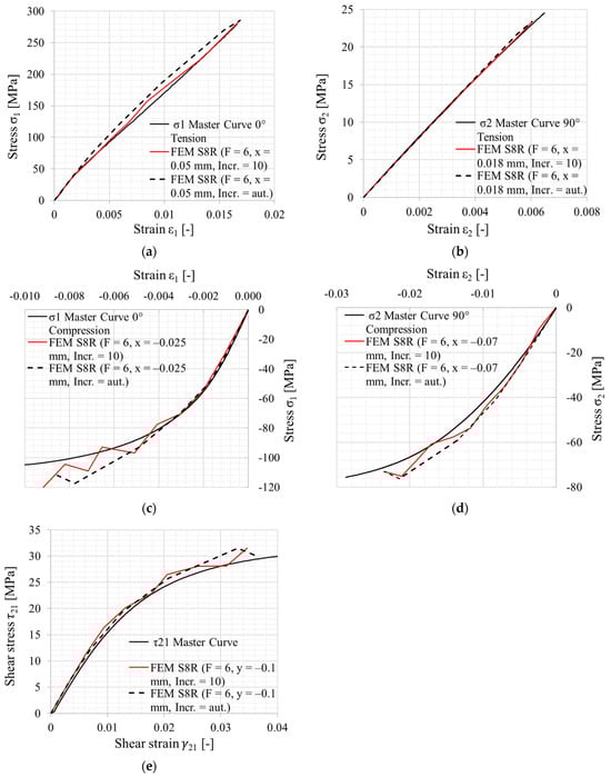 As can be seen in Figure 12a,b, positive ,)- and ,)-curves show a very good agreement with the calculated results, regardless of the incrementation choice. For negative ,)-, ,)-, and (,)-curves (Figure 12c–e), zigzag curves are observed with a fixed increment size. When an automatic time step is used, this effect disappears, and the calculated curves show good agreement with the master curves, although the fracture strength is calculated too high. The deviation is approximately 6% to 9%. Due to the complexity of the algorithms implemented in ABAQUS to calculate the time increment, no definitive conclusions can be drawn about the origin of this effect. However, it is recommended to work with automatic incrementation.