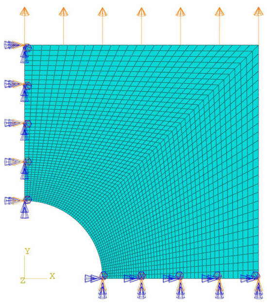 The laminate is defined as a symmetric and balanced 4-layer cross-ply laminate [45°; −45°]s with 1 mm thickness. The mesh size around the hole varies between 0.1 mm and 1 mm and gradually increases towards the outer edges of the model due to decreasing local stress gradients (Figure 14). S4R and S8R5 were selected as shell elements, and the layer-wise shear stress S12, the von Mises stress, and the maximum reaction force RF2 were used as comparative values.