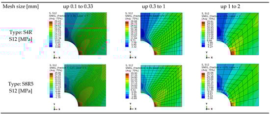 Comparison of the shear stresses S12 in the outer layer depending on the mesh size and mesh type (cross-ply laminate (45°; −45°)s).