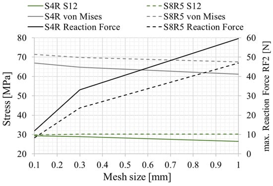 Figure 15 illustrates the quantitative comparison of shear stress S12, von Mises stress, and the resulting maximum reaction force RF2. The S12-values obtained with S8R5 elements remain stable across the entire range of mesh sizes. The S12-values for S4R elements are smaller compared to those obtained using S8R5 elements but converge towards the trend observed for S8R5 elements as the mesh size decreases. The von Mises stress increases with mesh size for both element types, but the increase is more visible for S4R elements. This indicates a stronger influence of mesh size on von Mises stress values.