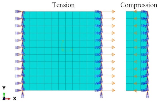 Numerical model of RSE (3 × 3 mm2) with boundary conditions for tension, compression, and shear loads.