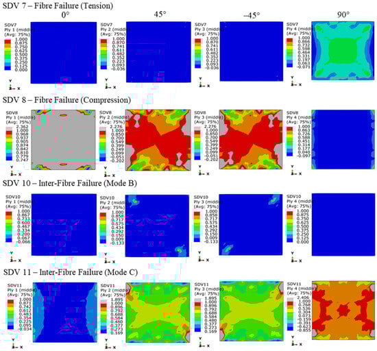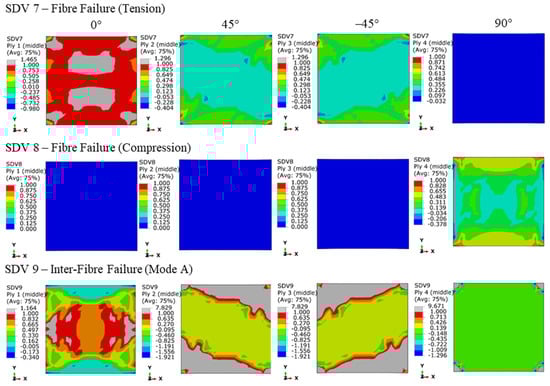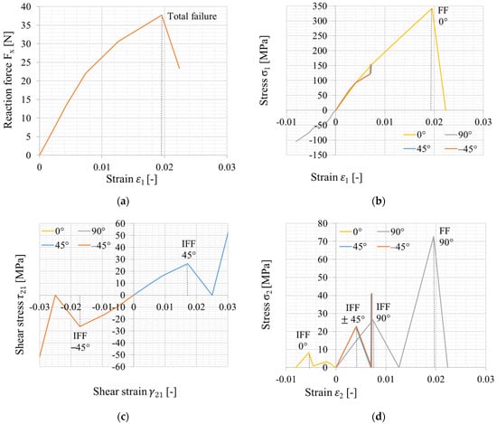 Figure 17 illustrates the failure plots resulting from a positive external displacement of x = 0.06 mm. To better highlight the failure chronology, Figure 15 presents the reaction force and layer-wise stress–strain curves of the middle element. After a nonlinear force response, total failure occurs at a strain of due to simultaneous fiber tensile failure in the layer (SDV7 > 1). Before this, IFFs Mode A develops in the and layers (SDV 9 > 1). Due to the loading direction, no IFF Mode B or C are observed.
