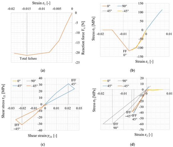 Figure 19 and Figure 20 show the results of the failure analysis under compressive loading with a negative external displacement of 0.06 mm. After the initial fiber compressive failure in the layer (SDV 8 > 1) at a strain of , a fiber failure occurs in the layers in the following calculation step. Simultaneously, IFF Mode C in the and layers led to a collapse of the RSE in the final increment due to progressive damage development. This is reflected in the hysteresis-like stress–strain curves in Figure 20c,d. As with tensile loading, the force response is nonlinear, with total failure occurring at a strain of .