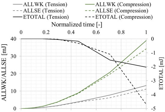 Figure 21 illustrates the energy evolution under tensile and compressive loading, highlighting the interplay between elastic energy storage, energy dissipation, and modeled material failure. A simple energy balance for the entire model can be written as: