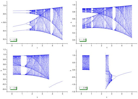 A fundamental way to understand the dynamic behavior of a chaotic map is through its bifurcation diagram, which illustrates the long-term steady-state behavior of as a function of the parameter values. Figure 2 presents the bifurcation diagrams of the ACLM for different values of r while varying s. The results indicate that the classical period-doubling route to chaos is visible for moderate values of r. As s increases, the bifurcation structure shifts, leading to earlier transitions into chaotic behavior. For larger values of s, the diagram exhibits more fragmented bands, indicating a richer chaotic structure than the standard logistic map. The breaking of symmetry in the diagram is evident, reinforcing the impact of the cubic term on the system dynamics.