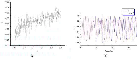 Figure 3a shows the Lyapunov exponent as a function of the parameter s and . The results confirm that the Lyapunov exponent remains positive over a wide range of s, indicating strong chaotic behavior. Higher values of s tend to increase the LE, which implies an enhanced level of unpredictability in the map.