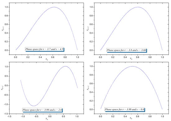 The phase space plots of the ACLM, shown in Figure 4, depict the relationship between and for different parameter values. As r increases, the shape of the attractor deforms, reflecting the impact of s in shifting the symmetry. The maps exhibit dense chaotic regions, confirming their suitability for cryptographic applications. While certain parameter values result in periodic orbits, others generate fully chaotic structures.
