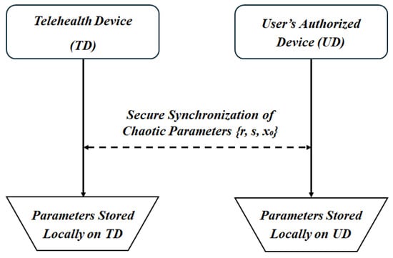 Figure 5 depicts the enrollment phase where both the Telehealth Device (TD) and the User’s Authorized Device (UD) securely synchronize their shared chaotic parameters, {r, s, }. These parameters are stored locally on both devices and are never transmitted over the network to prevent interception. This phase ensures that both devices share identical configurations, enabling consistent chaotic behavior during subsequent phases.