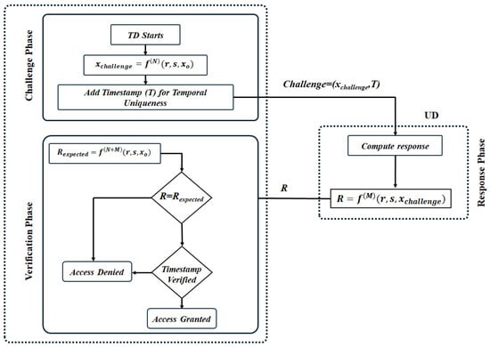 Overview of the authentication process. The figure illustrates the following three phases: (1) challenge generation, where the TD computes a unique chaotic challenge with a timestamp; (2) response generation, where the UD computes a response using the received challenge; and (3) verification phase, where the TD validates the response and determines the authentication outcome.