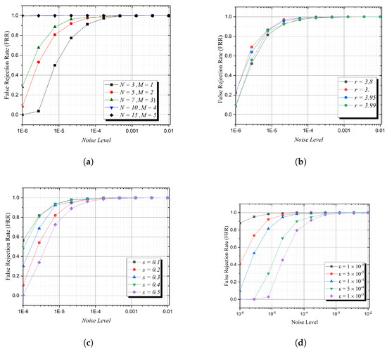 The transient phase played a crucial role in mitigating the effects of noise by allowing slight perturbations to remain within tolerable bounds before chaotic divergence set in. However, increasing N and M had a pronounced effect on FRR, as shown in Figure 7a. While larger values of N and M enhance security by making authentication responses more unpredictable, they also make the system more susceptible to noise. This effect is particularly evident when , where FRR reaches 100%, even at , indicating that excessive iterations amplify sensitivity to small perturbations.