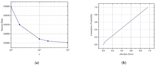 Figure 8a presents the probability of a brute-force attempt succeeding as a function of the tolerance . As expected, reducing the tolerance significantly decreases the probability of an attacker correctly guessing the response. For , the success rate is approximately , but as is reduced to , the probability of success drops to nearly zero, emphasizing the effectiveness of the chaotic authentication scheme in resisting brute-force attacks.