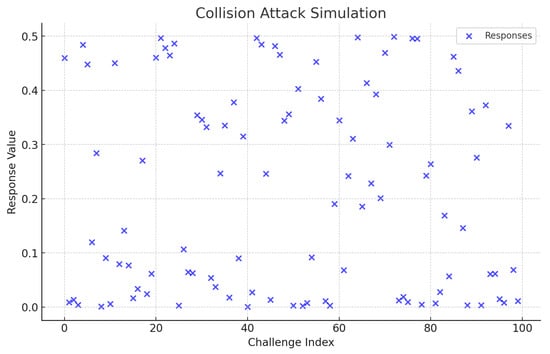 In the simulated attack, 100 random challenges were generated, and their corresponding responses were computed using the chaotic map. The results, visualized in Figure 9, show that no two challenges produced identical responses, demonstrating the system’s resilience against collision attacks. Blue dots represent unique responses for each challenge, and any collisions, if present, would have been marked in red for clear identification. The absence of red markers affirms the robustness of the chaotic map in preventing collisions and ensuring a secure response distribution.