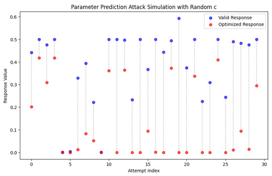 The results of the attack are illustrated in Figure 10. Each valid response, computed using the true chaotic parameters, is shown as a blue dot, while the corresponding response generated using the optimized parameters is represented by a red dot. Dotted gray lines connect the two responses for each challenge, emphasizing the deviation between the actual and predicted responses.