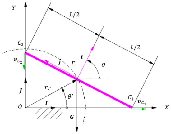 The ladder contacts the two walls in the points and . The only external force considered is the weight . In this case, it is assumed that the supports in the points and are ideal (without friction). It should be noted that the literature presents various variants of the problem—some include an additional force (such as the weight of a person) alongside the weight , or consider friction at the supports, which transforms the problem into a statics one. Next, we consider the situation when the only external force is the weight of the ladder applied in the middle of it, the point , and the supports are frictionless. Under these hypotheses, the weight causes the ladder to move such that point shifts to the right and point downward, and thus the rotation of the ladder has a trigonometric direction. Additionally, the centre of the rod moves along a circle centred at the origin with a radius . The segment is the median in the right triangle . From the Median Theorem, in the right triangle, the median is half of the hypotenuse . But since , the length of is constant and the centre of mass of the ladder moves on a circle of centre and radius /2. Since the system has one degree of freedom (1DOF) [21], it is possible to choose the polar angle of the position vector of the centre of mass as the parameter describing the rod’s position. For reasons to be explained later, the position parameter of the ladder is chosen as the angle between the normal to the ladder , with the horizontal direction. From simple geometrical considerations, it is shown that