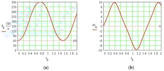 The nonlinear Equation (13) is solved numerically using the Runge–Kutta algorithm. In Figure 2, the solutions are shown: the angle θ and its time derivative, the angular velocity (denoted θ1).