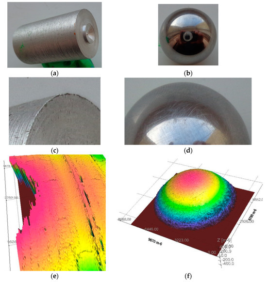 Regarding the friction between the rod and the walls, it cannot be eliminated by any means and is, therefore, included in the modelling. Here we have some remarks concerning the type of contact, and we compare two cases of ladder end–wall contacts: circular edge–plane and sphere–plane. These rod-ends are presented in Figure 3a,b, namely a circular cylinder and a sphere, detailed in Figure 3c,d. The microtopography of the contact regions obtained via laser scan profilometry is shown in Figure 3e,f. This highlights the fact that for the actual contact, the circular edge–wall contact presents more important discontinuities than the sphere–wall contact.