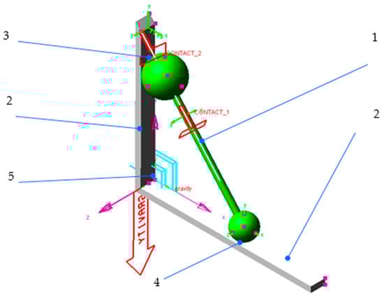 The dynamic system modelled using the MSC.ADAMS software: 1—mobile body; 2—leaning walls; 3, 4—sphere–plane contacts; 5—planar joint.