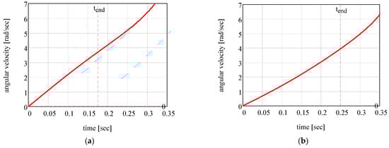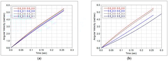 Variation in angular velocity, for two sets of coefficients of friction: (a) ; , (b) ; .