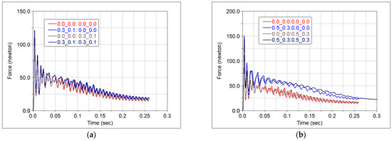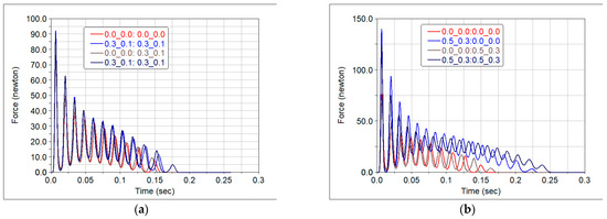 In order to characterise the friction at contacts 3 and 4, [24,25], two situations were considered, based on the values of the static and dynamic friction coefficients. In the first case, the behaviour was studied with the values and , while for the second case, the values and were used. Four scenarios were simulated: (a) both contacts without friction; (b) friction occurs only at the lower contact; (c) friction occurs only at the upper contact; (d) friction is present at both contacts.