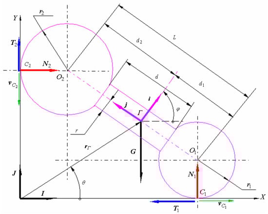 where are the coefficients of dynamic friction between the spheres and the walls. The unknowns of the problem are the position parameter of the system represented by the angle and the two normal reactions and . In order to find these reactions, the theorem of momentum is applied—specifically, the centre of mass motion theorem, as well as the angular momentum theorem with respect to the centre of mass [33,34]. For applying these theorems, the inertial characteristics of the body must be known, that is, the mass , the position of the centre of mass , and the moment of inertia about a central axis normal to the plane of motion. The body is composed of three simple elements: two spheres of masses , and a cylindrical rod of mass :