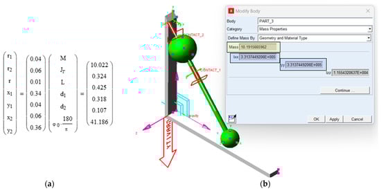 Geometric and inertial characteristics of the mobile body: (a) deduced analytically; (b) found using dynamic simulation software (model of mobile body—green; force—red arrow; planar joint—cyan; fixed system of coordinate—magenta).