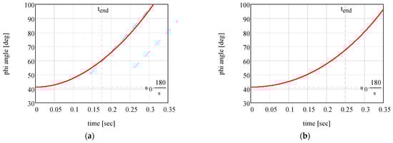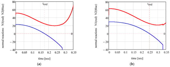 Figure 11 presents the analytical results for the time variation in the rotation angle , and the angular velocity , for two tribological situations. It can be noticed that the angle (that stipulates the position of the mobile body) increases from an initial value to a final value, corresponding to the time . In Figure 12, the variations in the normal reactions and . These plots correspond to two values of the coefficient of dynamic friction: (a) and (b) . The moment when detachment between the body and the vertical wall occurs is denoted , found from the condition . Beyond this moment, the relations obtained from system (36) are no longer valid. For time values greater than , the relations are given in [37]. Figure 13 illustrates the variation in the magnitudes of the normal reactions and for the same friction coefficient values.