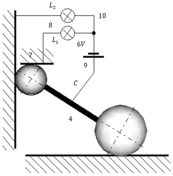 The walls that confine the body’s motion to the vertical plane are shown in Figure 14a. The half-cylinder grooves (1) were made from copper pipe, diameter , split axially. The two grooves were fixed on the two sides of the timber frame (3), with the parallelepipedal parts (3). The mobile body (4), detailed in Figure 14b, was made of two identical steel balls, of diameter . Threaded holes were made by electro-erosion in the balls. The threaded rod ,, was the connecting element between the balls, secured by two screw-nuts. After assembly, the distance between the centres of the balls was . To track the position of the mobile body, two scales (5 and 6), graduated in millimetres, were attached to each of the parts (3). A stopper (7) (detail in Figure 14c) was mounted on the vertical arm of the frame to ensure that the mobile body was always launched from the same initial position, corresponding to an angle . Two critical moments needed to be recorded: first, the start of the motion, and second, the instant when the upper contact disconnected. To identify these moments, two electrical circuits were implemented. The mobile body (4), the copper wires (10), a d.c. source (9), and the two diodes (8) were the elements of these circuits (detail in Figure 14c) and the circuit schematics are presented in Figure 15. In each circuit, the mobile body made a contact, either with the stopper (7), or with the vertical groove. To ensure that the motion of the body was not appreciably influenced by the wiring, a single copper wire , diameter , was used for all the circuit connections. According to Figure 15, with the body in launching position, both circuits were closed and the LEDs and were on. After the start of motion, the contact between the upper ball and the stopper opened and the LED was off. The LED remained on until the moment , when the mechanical contact between the upper ball and the vertical groove was disrupted.