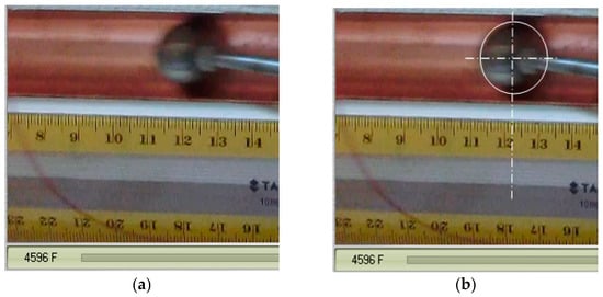 For the experimental study of the mobile body, a non-contact body method was chosen, because the use of any sensor [38] placed on the mobile body could affect the inertial characteristics of the sensor-body assembly and implicitly, the motion. Additionally, the presence of the sensor could produce the displacement of the centre of mass from the axis of revolution of the body, potentially transforming the motion from plane-parallel to a spatial one—a scenario that would be more challenging to model. The first non-contact method intended involved an ultrasound displacement sensor [39]. This method presents the advantages of providing a precise dependency of the displacement versus time but the major drawback is the impossibility of establishing the start and final moments (when the detachment from the wall occurs). Ultimately, the selected method involves video recording the horizontal motion of the lower ball using a camera operating at . The recorded video is then split into individual frames using specialised software, and by analysing these frames, a numerical dependency is obtained, where is the time instant and is the position of the centre of the lower ball, red on the horizontal scale. The methodology of finding the position of the lower ball’s centre is shown in Figure 16. A still frame (4596F) from the experiment is shown in Figure 16a, and in Figure 16b, a circle enveloping the ball is placed on the trace, the axes of the circle define the centre, and the value of the displacement is identified on the ruler.