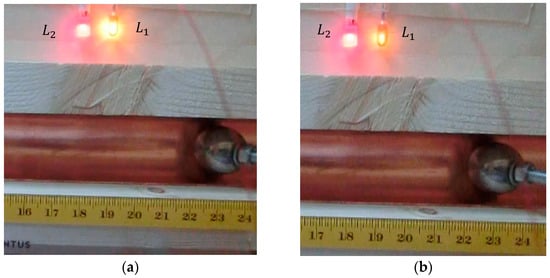 The moment when the contact between the upper ball and the stopper is disrupted is identified as shown in Figure 17. Two successive images (time lag ) of the two diodes are shown. In Figure 17a, the intensity of light is higher than the one from Figure 17b, the circuit being interrupted in the latter. Obviously, due to thermal inerty, diode is not off instantaneously, but the difference in brightness is enough to identify the moment when the contact is disrupted. A similar procedure is applied for identifing the moment when the mechanical contact between the vertical groove and the ball is interrupted.