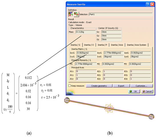The geometrical and inertial characteristics of the mobile body—the mass and the central principal moments of inertia, obtained analytically—are shown in Figure 10a, while the corresponding values obtained using the simulation software are shown in Figure 10b.