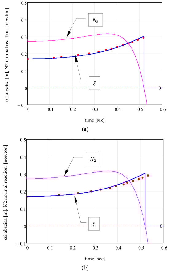 Figure 20 compares the analytical and experimental results for the displacement of the centre of the lower ball, for the two data sets from Table 1, and also the plot of variation in the normal reaction , in order to highlight the moments of detachment from the vertical wall. Very good concordance between the experimental data (red points) and analytical results (blue plot), which validated the proposed theoretical model, can be seen.
