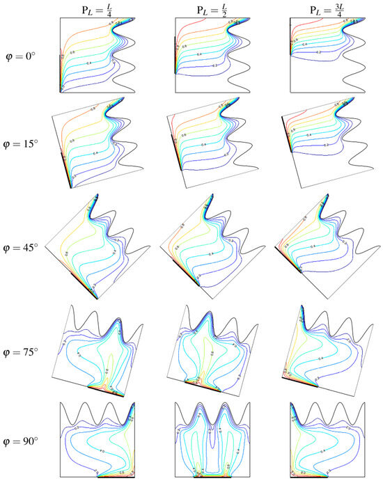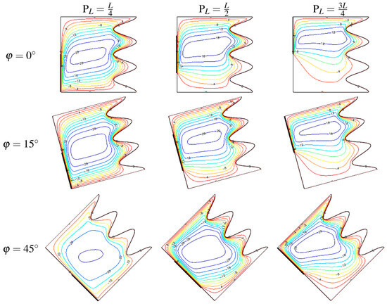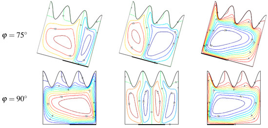 The thermal distributions within the curved porous domain with waviness λ = 3 and A = 0.15 at for diverse heater places and the tilting angle of the cavity are displayed in Figure 2. The temperature contours are first observed to extend from the heat source to sink (cold wall), and the cavity’s thermal stratification almost precisely parallels the horizontal plane. This suggests that when RaD = 103, the convective mode is the predominant route of heat transmission across the domain. It is also observed that the area within the curved cavity where the temperature field is occupied is determined by the heater’s location on the left sidewall. In other words, during bottom heating, the temperature field is evenly spread across the cavity when φ = . In contrast, while moving the heater from the center to the top, the heater’s leading edge starts the process of thermal stratification, which results in the cold fluid saturation of the surrounding area. Moreover, the overall temperature distribution within the curved porous domain is impacted by the cavity inclination. The isotherms within the cavity move to align with the horizontal plane when the cavity is inclined. At and , the structure of the heater resembles a plume, and the isotherms line up with the adiabatic walls. The isotherms’ clustering illustrates the formation of thermal boundary layers (TBLs) along the heat source. Furthermore, the isotherms are concentrated in the area between the second and third undulations of the cold wall, or at the upper-right corner of the cavity. TBLs form in particular regions, indicating the presence of a strong temperature difference.