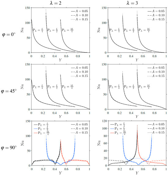 In examining the impact of the right wall’s waviness on the local Nusselt number fluctuation, it is evident that for both λ = 2 and 3, at every heating position along the heater, but especially at the leading edge, the local energy transport rate rises as the amplitude of the curved right sidewall rises. This is because the raised amplitude of the curved right sidewall upsurges the possibility of heat exchange between the walls, thereby shortening the distance between the cold wall and the heater. Compared to bottom and center heating, the leading edge of the heater clearly exhibits a higher rate of heat transmission due to the two undulations on the right sidewall. The right sidewall’s concave parts and the heater’s edges are close together, which raises the rate of heat transmission at those locations. When the heater is placed at the lower and center location, the convex part of the curved wall and the concave area for upper heating are always level with the heater’s leading edge. However, the right sidewall is curved and features three undulations. Because of this, when the heating site shifts from the bottom to the top, the leading edge’s energy transport rate rises. Consequently, the undulation of the right wall also clearly shakes the distribution of the rate of heat energy transport.