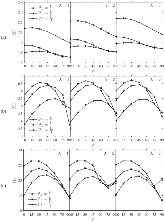 Averaged Nusselt number vs. inclination angle at different heater locations with A = 0.15 when (a) RaD = 10, (b) RaD = 102, and (c) RaD = 103.