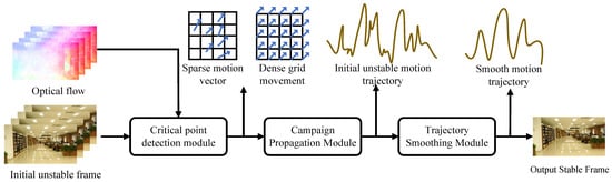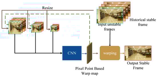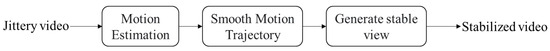 Digital image stabilization is mainly implemented through software and mostly does not depend on specific hardware devices, such as [8,9,10,11,12,13,14,15,16]. Its fundamental principle involves accurately estimating undesired camera motion from video frames and compensating for such motion through appropriate geometric or optical transformations, as schematically illustrated in the stabilization pipeline of Figure 4. Although DVS exhibits slightly less advantageous processing speeds compared to optical stabilization, it delivers superior performance in terms of stabilization quality and operational flexibility. A defining advantage of DVS lies in its unique capability: it represents the sole technology capable of stabilizing pre-recorded videos post hoc, a critical feature for retrofitting stability to existing footage. With technological advancements, DVS has further diverged into two distinct paradigms, traditional model-driven methods and emerging deep learning-based approaches, expanding the research and application frontiers for video stabilization.