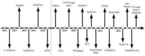 Since deep learning technology entered the field of video stabilization in 2018, digital video stabilization methods have shown a trend of diversification. Compared with traditional methods, these methods, while dealing with video jitter, adopt different training strategies to reduce the possible distortion and cropping problems during the stabilization process. More importantly, the speed advantage brought about by deep learning makes online video stabilization possible. Figure 5 shows various digital video stabilization methods mentioned in this paper in chronological order. The part before the dotted line represents traditional video stabilization technologies, while the part after the dotted line demonstrates new video stabilization methods based on deep learning.