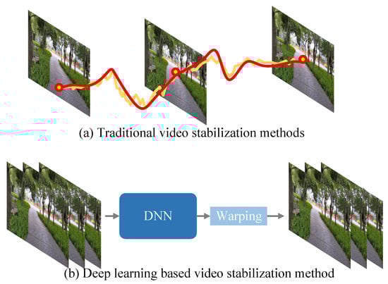 Currently, research in digital video stabilization (DVS) is predominantly categorized into two paradigms: traditional methods and deep learning-based approaches. Traditional methods rely on manually designed and meticulously extracted features, as shown in Figure 6a. This process demands substantial professional expertise and involves complex operational workflows. In contrast, deep learning-based video stabilization does not directly compute or visualize camera motion trajectories. Instead, it employs supervised learning models for stabilization processing, as illustrated in Figure 6b. Notably, deep learning-based methods have demonstrated superior performance in recent studies [23,24,25,26,27,28,29], primarily due to their capability to automatically extract high-dimensional features. This eliminates the reliance on manual feature extraction and matching, thereby enhancing stabilization effectiveness. In this paper, we provide a systematic overview of DVS by categorizing algorithms into traditional and deep learning-based approaches. The objective is to comprehensively organize the current landscape of video stabilization and systematically expound on digital video stabilization techniques within these two frameworks.